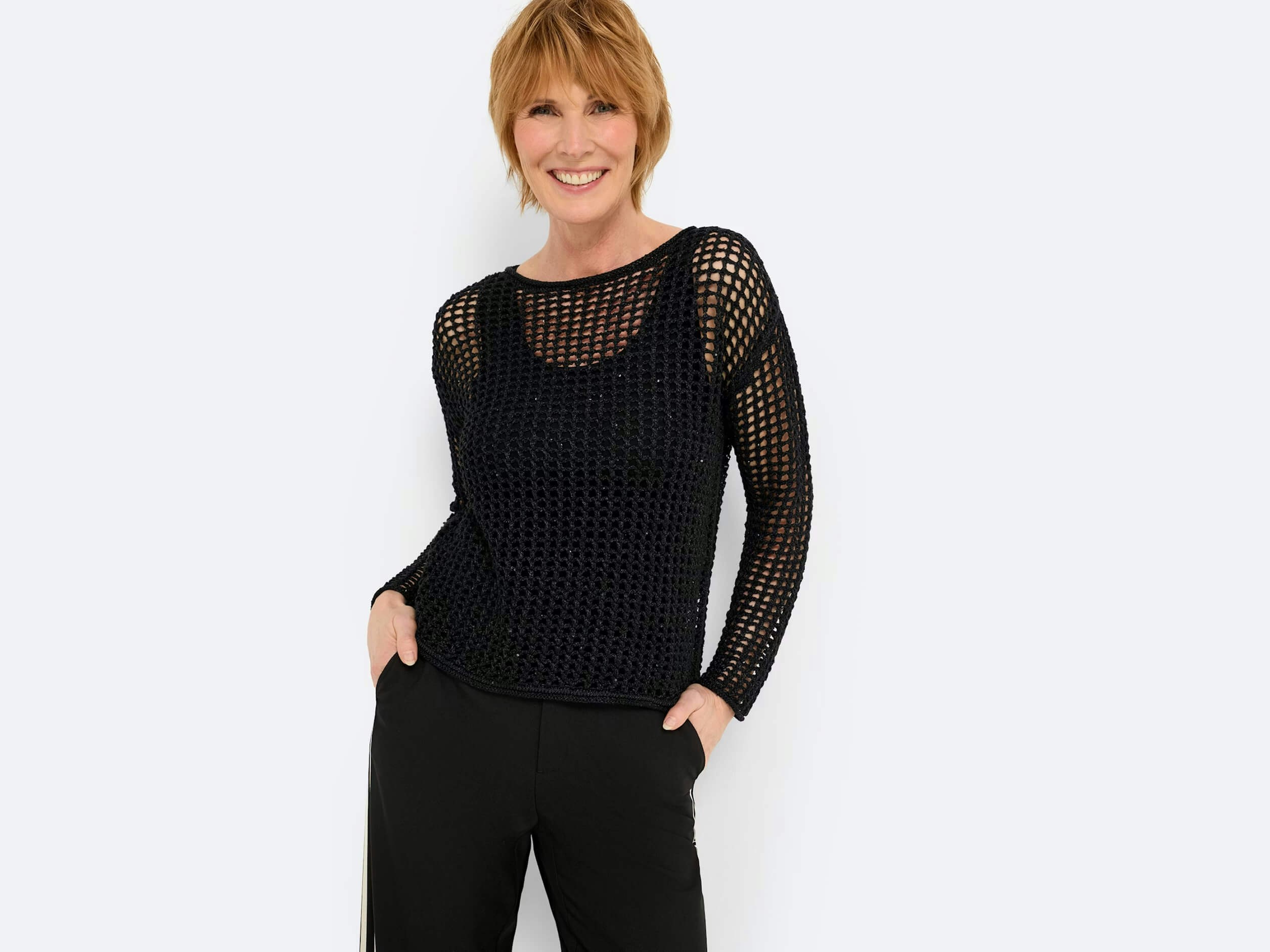 Dieser locker gestrickte Pullover mit feinem Lochmuster und dezenten Pailletten vereint feminine Eleganz und Tragekomfort. Rundhalsausschnitt, Rollkanten und überschnittene Schultern runden den modernen Look ab.
