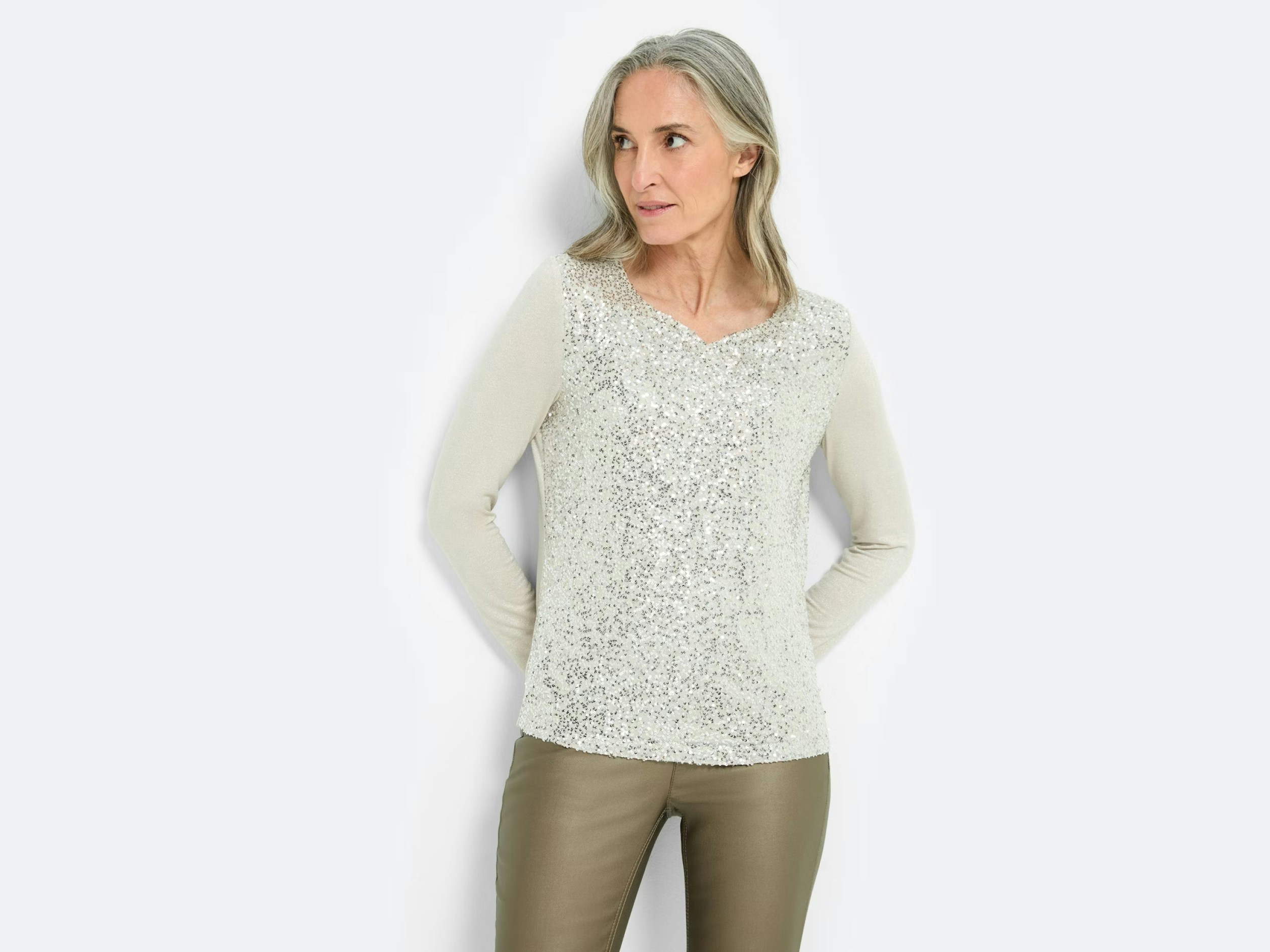 Dieses Langarmshirt besticht durch einen geschwungenen V-Ausschnitt, eine Rückenpasse und eine Falte für lockere Weite. Glitzernder Effekt und Pailletten-Overlay auf der Vorderseite verleihen dem Shirt eine festliche, elegante Note – perfekt für besondere Anlässe oder stylische Alltagslooks.
