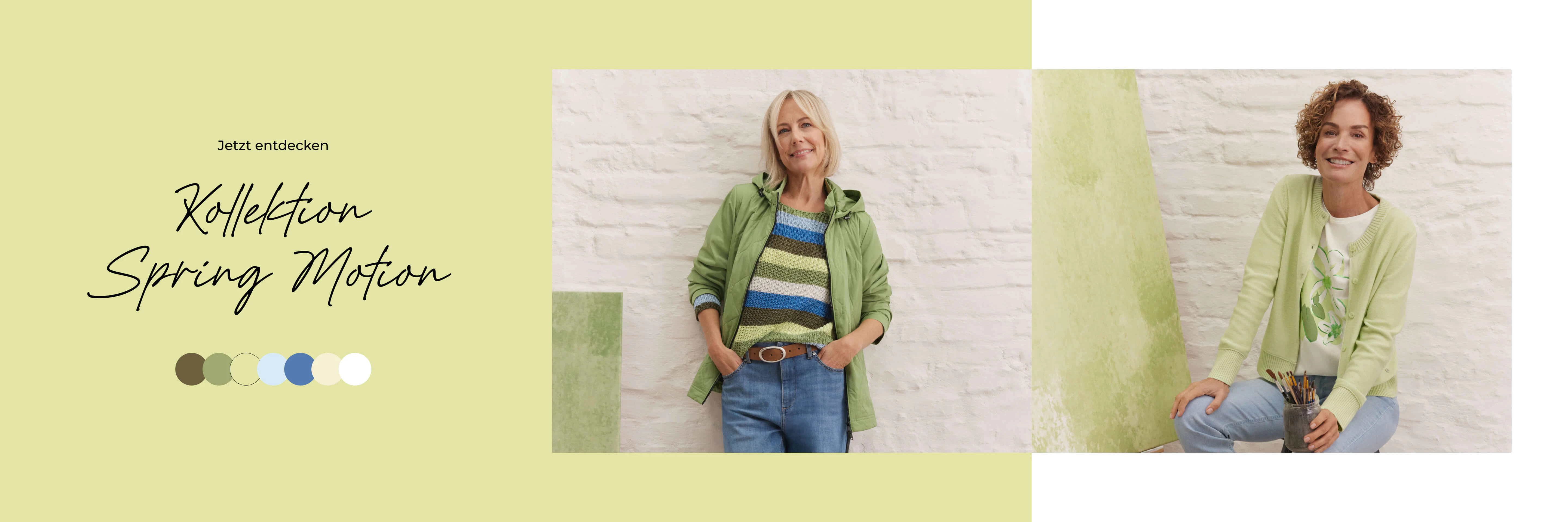 Die Kollektion überzeugt durch eine große Vielfalt an Styles, die Individualität und Kreativität unterstreichen. "Spring Motion" verbindet feminine Leichtigkeit mit sportiver Modernität und begleitet Sie stilvoll durch aktive Frühlingstage. Mit liebevoll ausgewählten Kleidungsstücken schaffen wir Mode, die Spaß macht. Trendige Stücke wie Blazer, Kleider und Röcke sind essenzielle Bestandteile der modernen Damengarderobe. Ein gut sitzender Blazer sollte in keinem Kleiderschrank fehlen. Accessoires wie Tücher, Gürtel und Handtaschen sind die perfekte Ergänzung, um Ihren persönlichen Look zu vervollständigen.