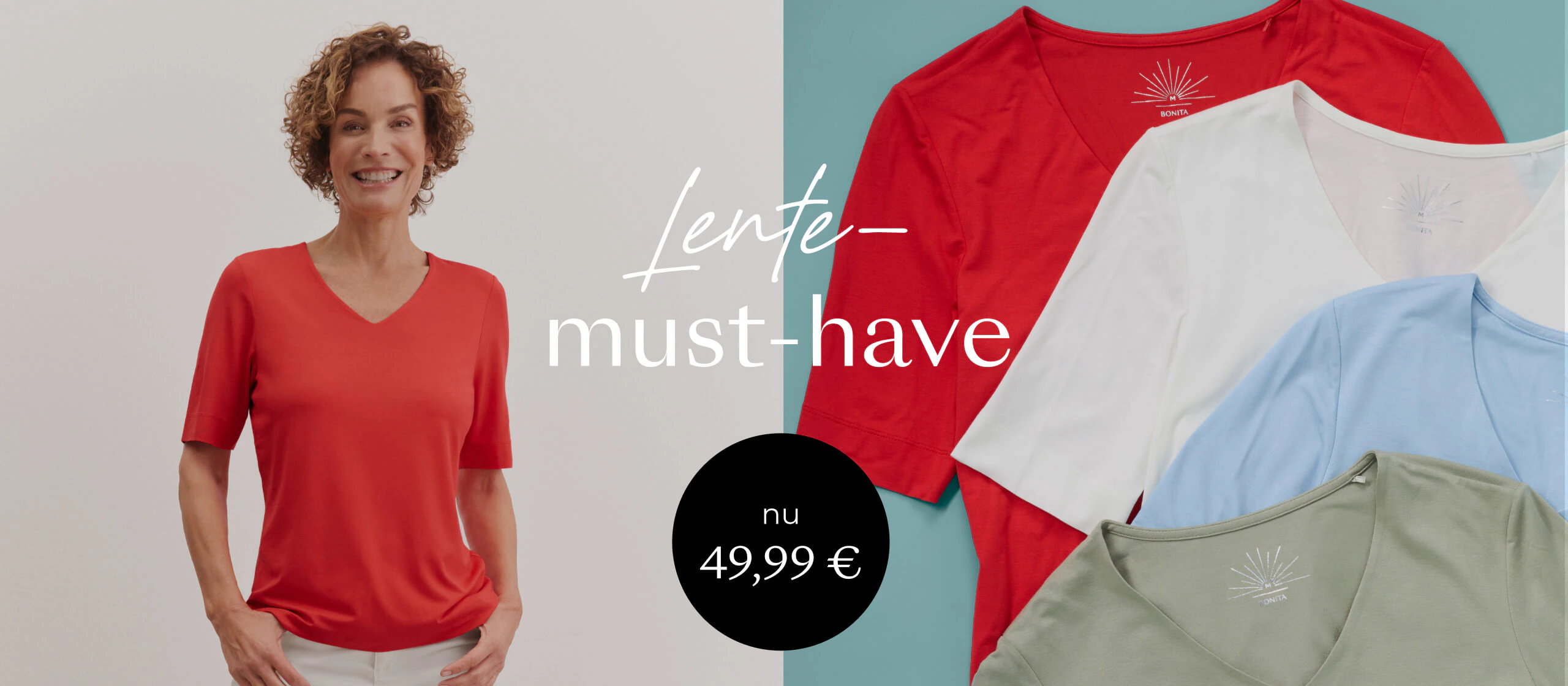 Wij maken mode die je kunt en wilt dragen. Perfecte pasvorm en maximaal comfort, evenals merkgerichte kwaliteit voor de behoeften van mensen die midden in het leven staan, vormen ons DNA. Twijfel je over het bestellen van dameskleding in onze online shop? Winkel je liever in een van onze winkels? Met gedetailleerde maattabellen en pasvormtips willen we ervoor zorgen dat je online de damesmode vindt die bij je past. Onze jeans en t-shirts zijn vooral populair vanwege de perfecte pasvorm en het hoge comfort in je casual look. Als je ze eenmaal hebt geprobeerd, wil je ze nooit meer uittrekken. Ontdek de verschillende bestsellers in de categorie Bestseller in de webshop - de favorieten van onze klanten die zelfs aan de hoogste eisen voldoen. Omdat mode er niet alleen goed uit moet zien, maar ook leuk moet zijn en goed moet voelen voor iedereen.