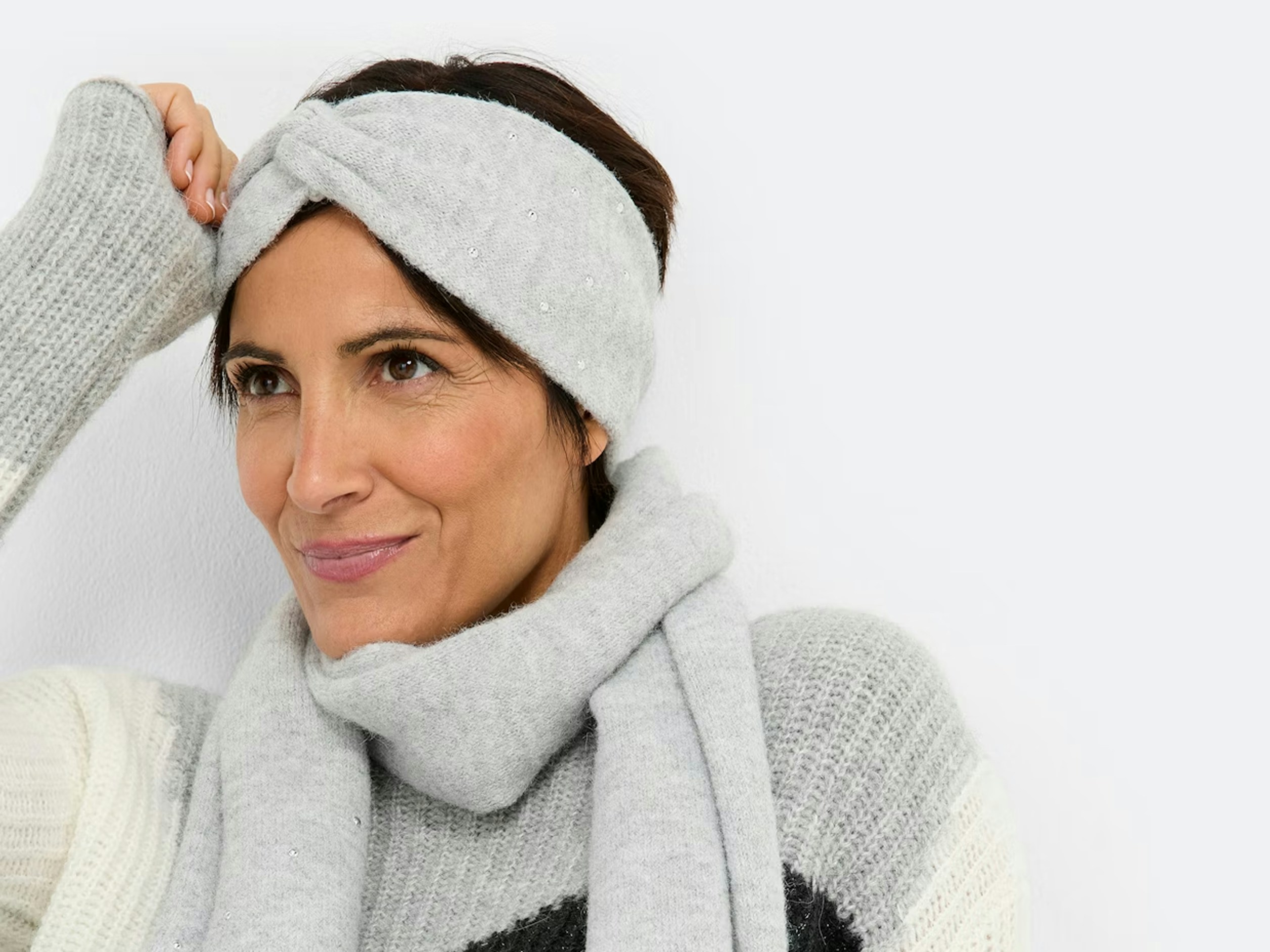 Zacht, warm en stijlvol: onze gebreide sjaal met geribbelde uiteinden en fijne studs zorgt voor gezellige winterlooks. Bijpassend is er de elegante hoofdband. Perfect te combineren voor ontspannen winterdagen – stijlvol, gezellig en veelzijdig te dragen.