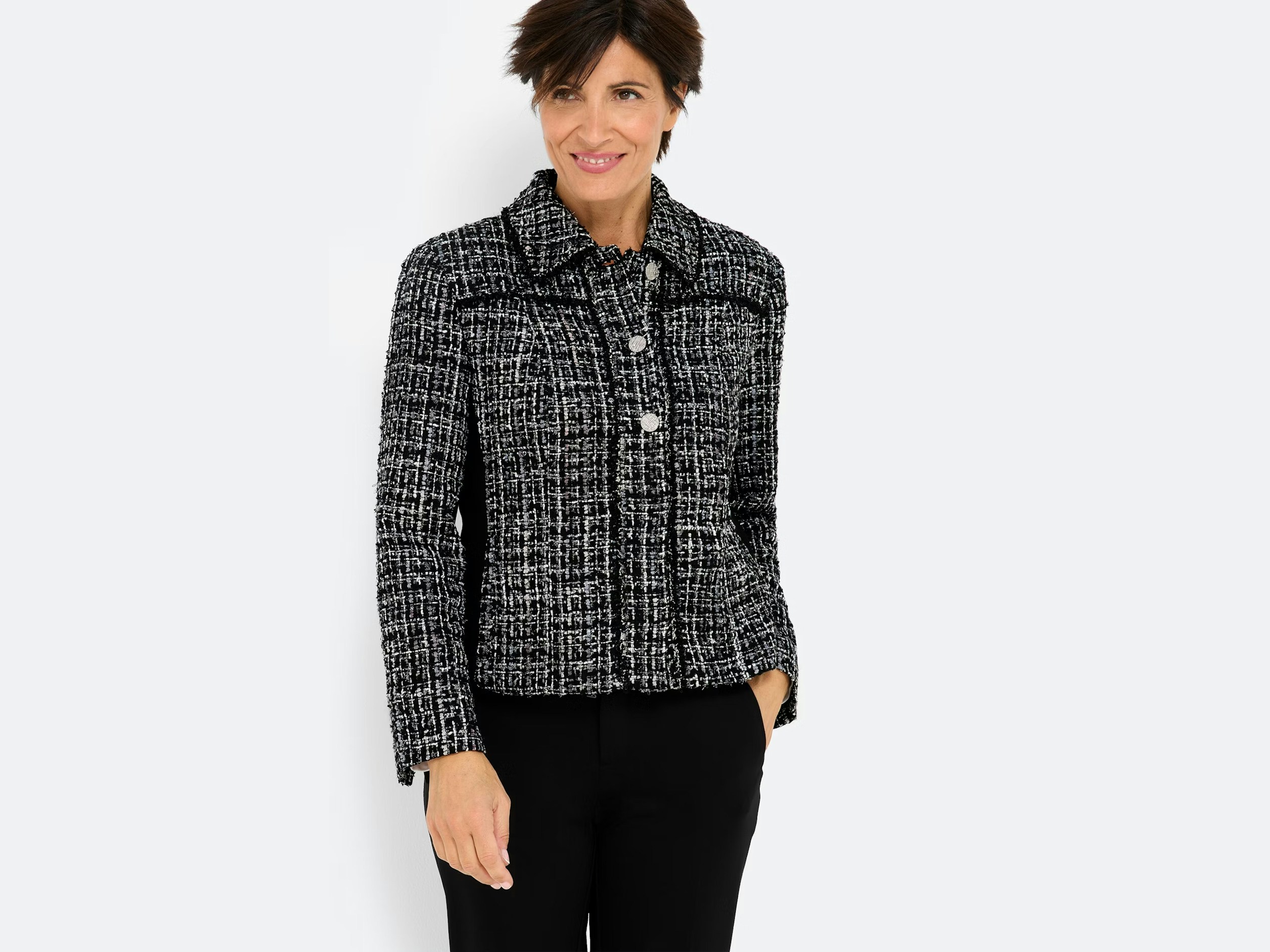 De bouclé blazer met jersey inzetstukken aan de zijkanten combineert een edele textuur met aangenaam bewegingscomfort. Twee glanzende sierknopen maken het ontwerp af en geven elke outfit een vleugje feestelijke verfijning.