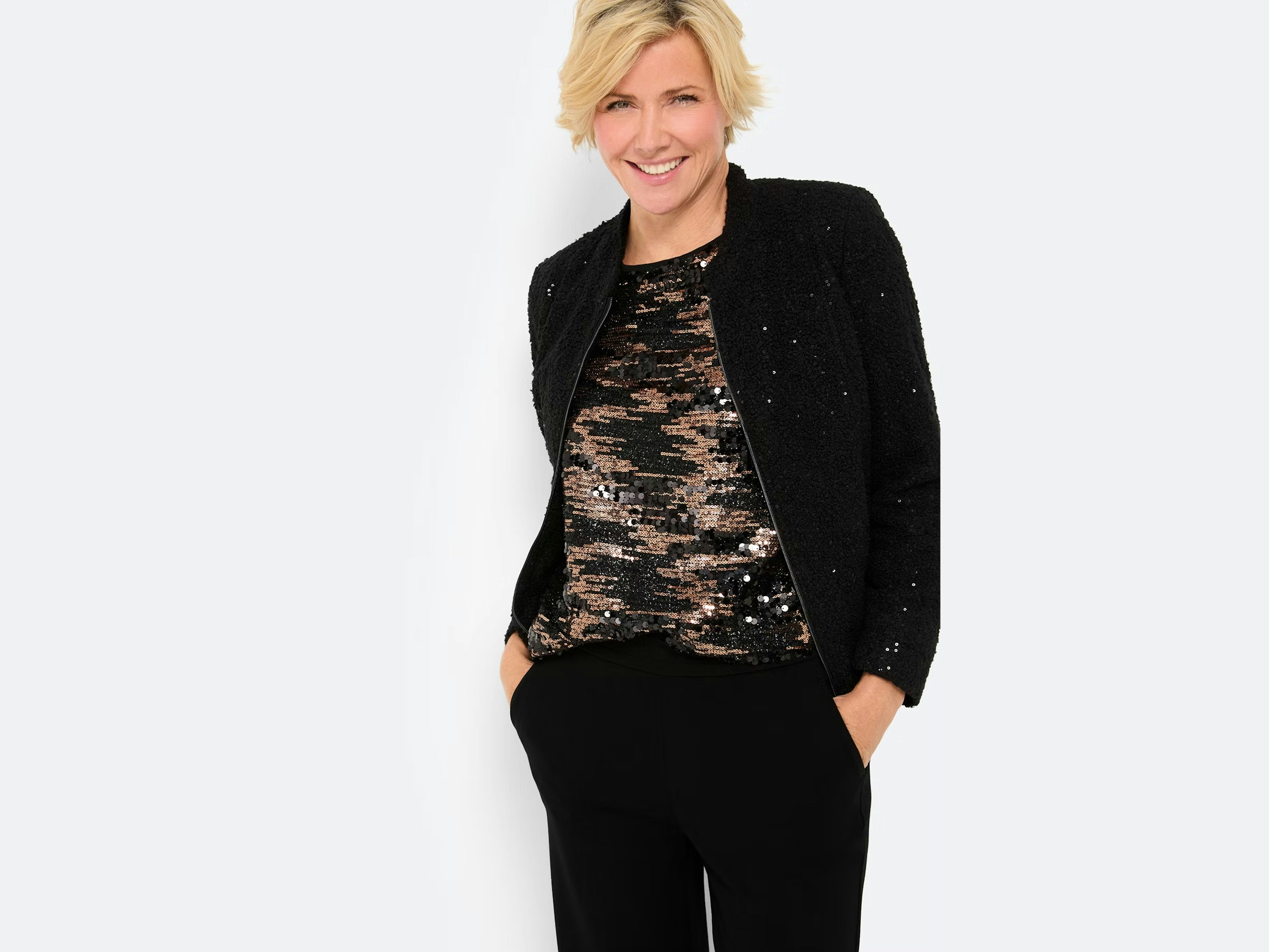 De getailleerde blazer zorgt voor stijlvolle accenten: een kleine opstaande kraag, twee zakken met ritssluiting en korte mouwsplitten worden gecombineerd met een tweewegritssluiting voor veelzijdige draagmogelijkheden. Pailletten en de bouclé-kwaliteit maken dit kledingstuk tot een echt stylinghoogtepunt. Perfect voor feestelijke looks of elegante casual outfits met glamourfactor.