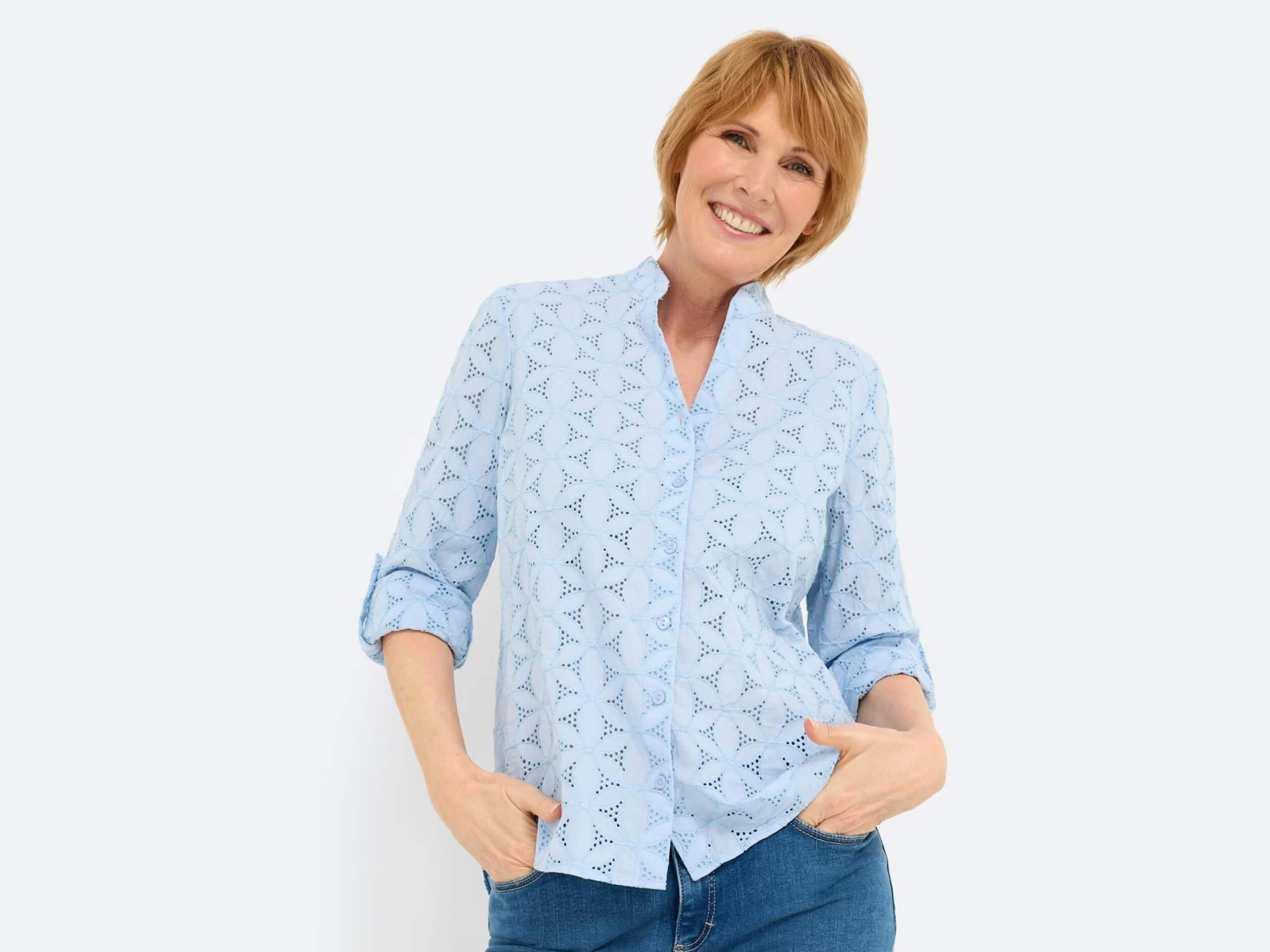 deze blouse valt op door het filigraan all-over borduursel, de elegante opstaande kraag en de omgeslagen mouwen voor verschillende stijlen. Een vrouwelijke allrounder die elke outfit meteen een luchtige, modieuze touch geeft.