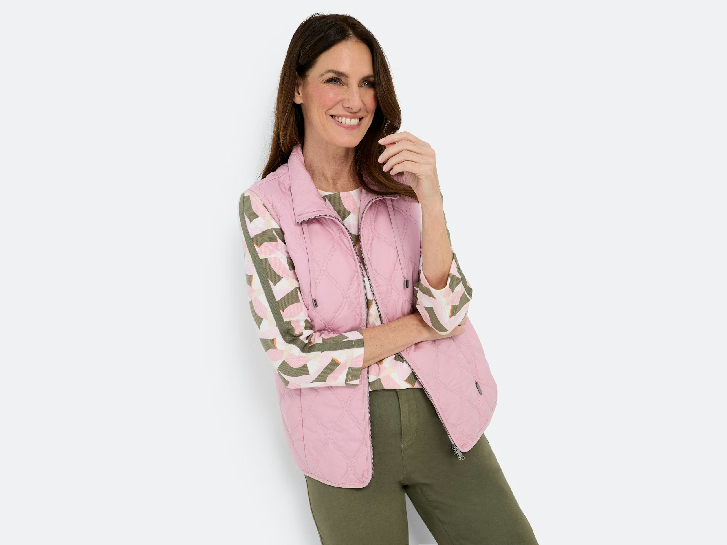 Licht gewatteerd vest met gebogen quiltpatroon, opstaande kraag met trekkoord en tweewegritssluiting. Twee praktische zakken met ritssluiting maken de urban look compleet – ideaal voor casual looks voor het tussenseizoen.