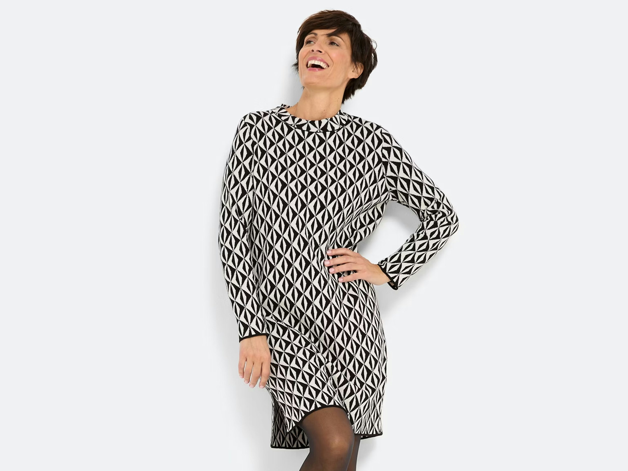 Deze knielange jurk in zwart-wit jacquard valt op door zijn geometrische print, die stijlbewustzijn en verfijning uitstraalt. De gestructureerde kwaliteit benadrukt het silhouet en geeft de look een moderne, elegante touch.