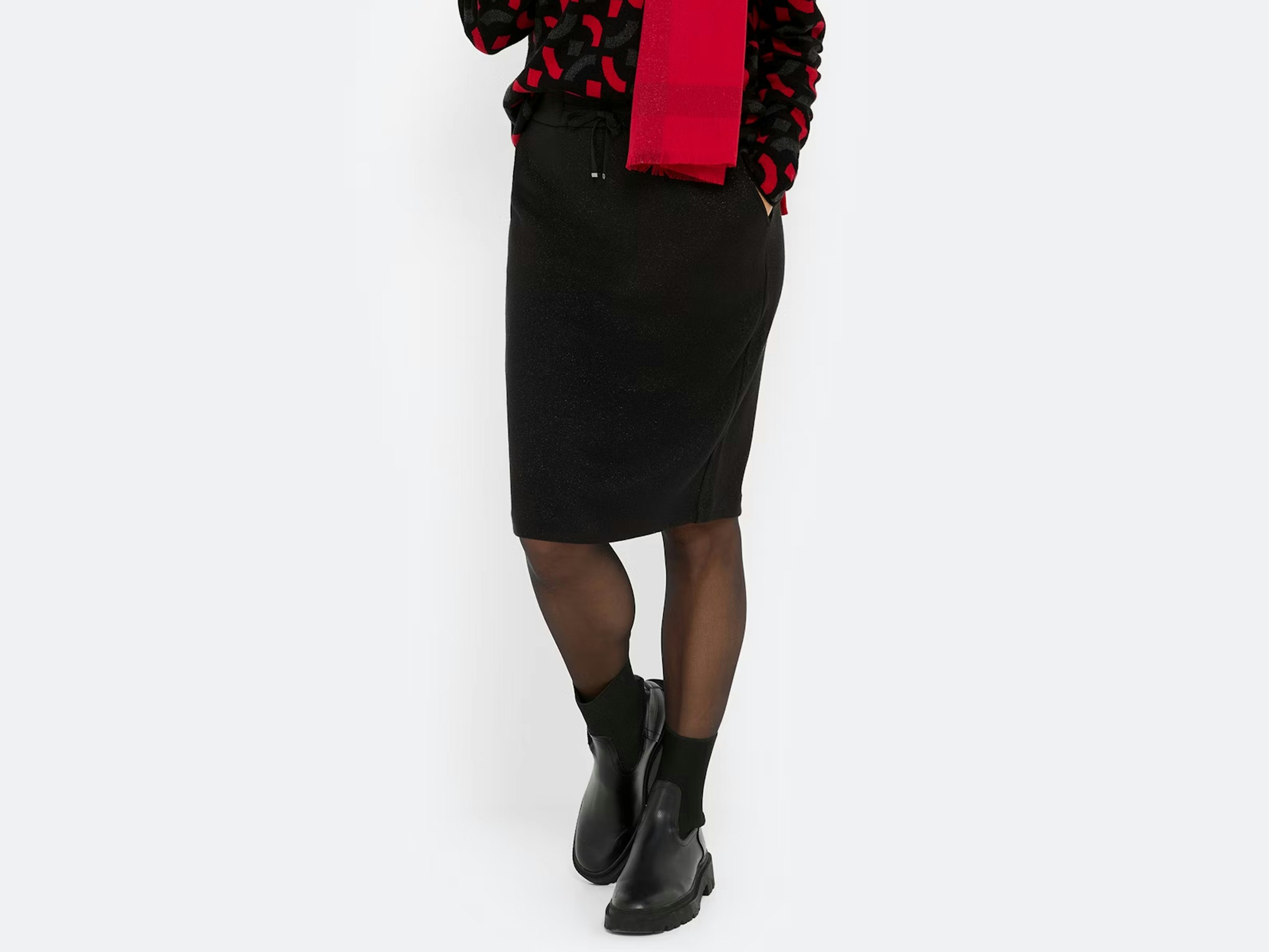 De knielange gebreide rok in zwart wordt door fijne lurexdraden subtiel een blikvanger. Het vrouwelijke silhouet en de elegante glans maken hem tot de perfecte metgezel voor feestelijke looks of elegante alledaagse outfits.