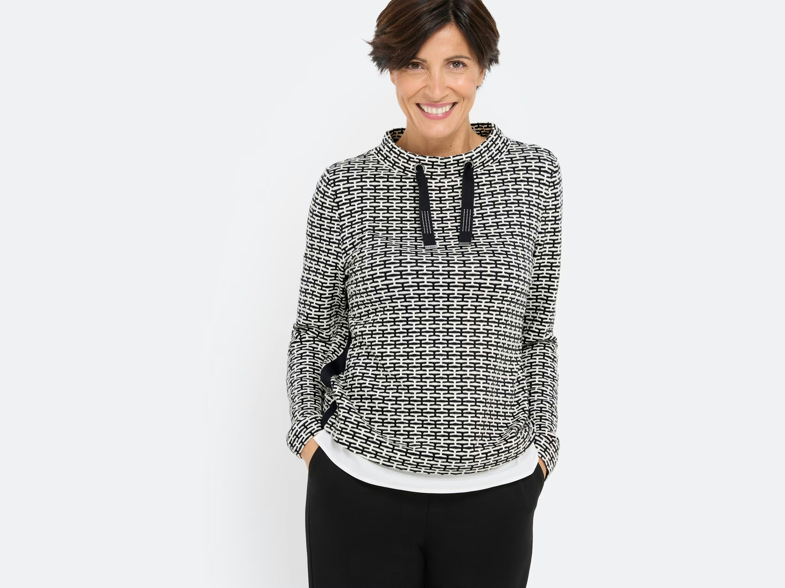 Het jacquard sweatshirt in zwart-wit valt op door zijn gestructureerde look en de ingezette boord in blouse-look, die de indruk wekt alsof er een blouse onder zit – zonder extra laag. Comfortabel, modern en perfect voor veelzijdige winterlooks.