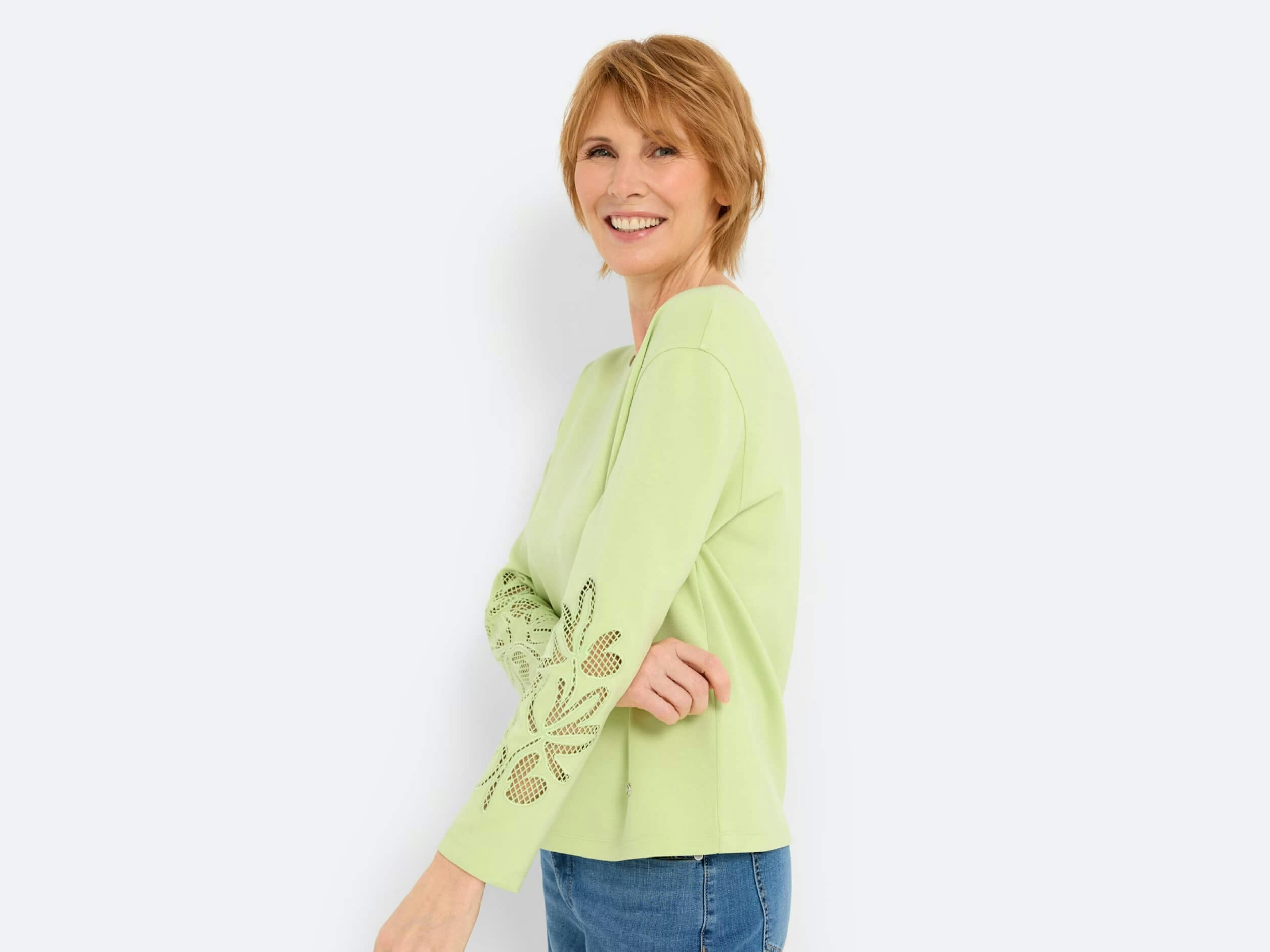 dit effen sweatshirt in hip groen heeft stijlvolle accenten met borduursels en cut-out details op de mouwen. Het is comfortabel en casual tegelijk en daarmee een eyecatcher voor casual looks met een bijzondere twist.